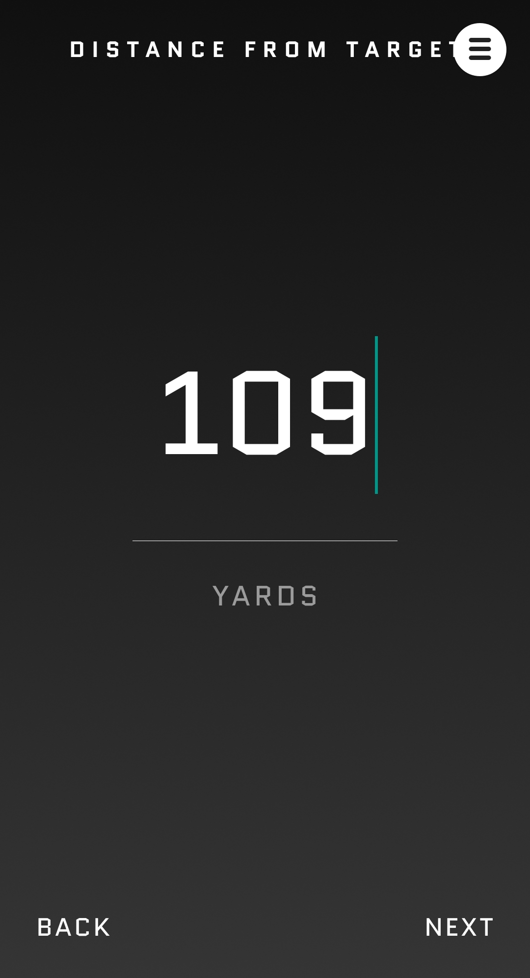 The next screen you are taken too is the DISTANCE FROM TARGET screen. Currently the app only gives you the option to set your distance in YARDS. I prefer to work in METERS. Knowing 100m is 109.36 Yards I chose to round down for this and have it set at 109 Yards. Note: you can if you want to, use the decimal point to be exact.