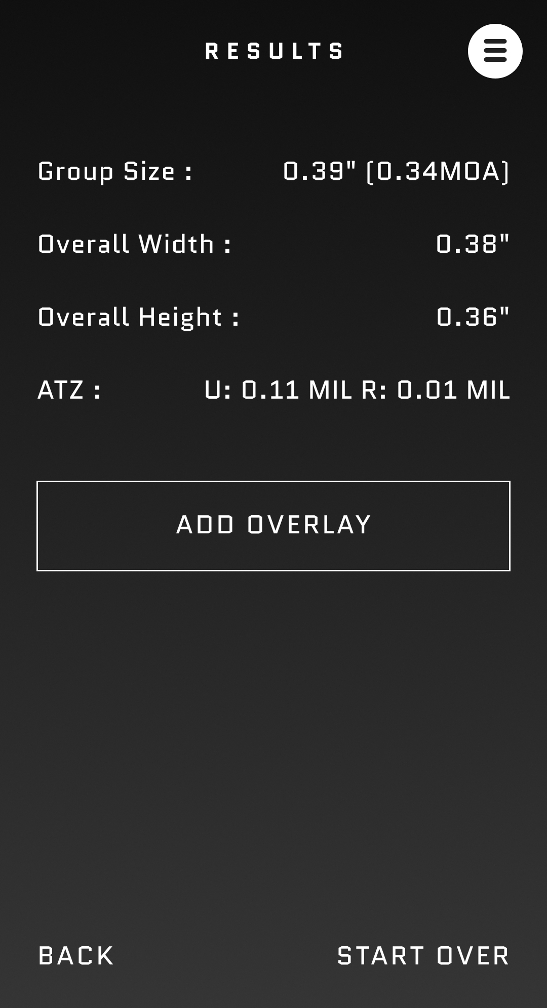 Once you have marked your impacts the app will take you to a RESULTS screen. This screen will give you your Group Size, Overall Width, Overall Height, ATZ (Average To Zero), the option to ADD OVERLAY or START OVER.