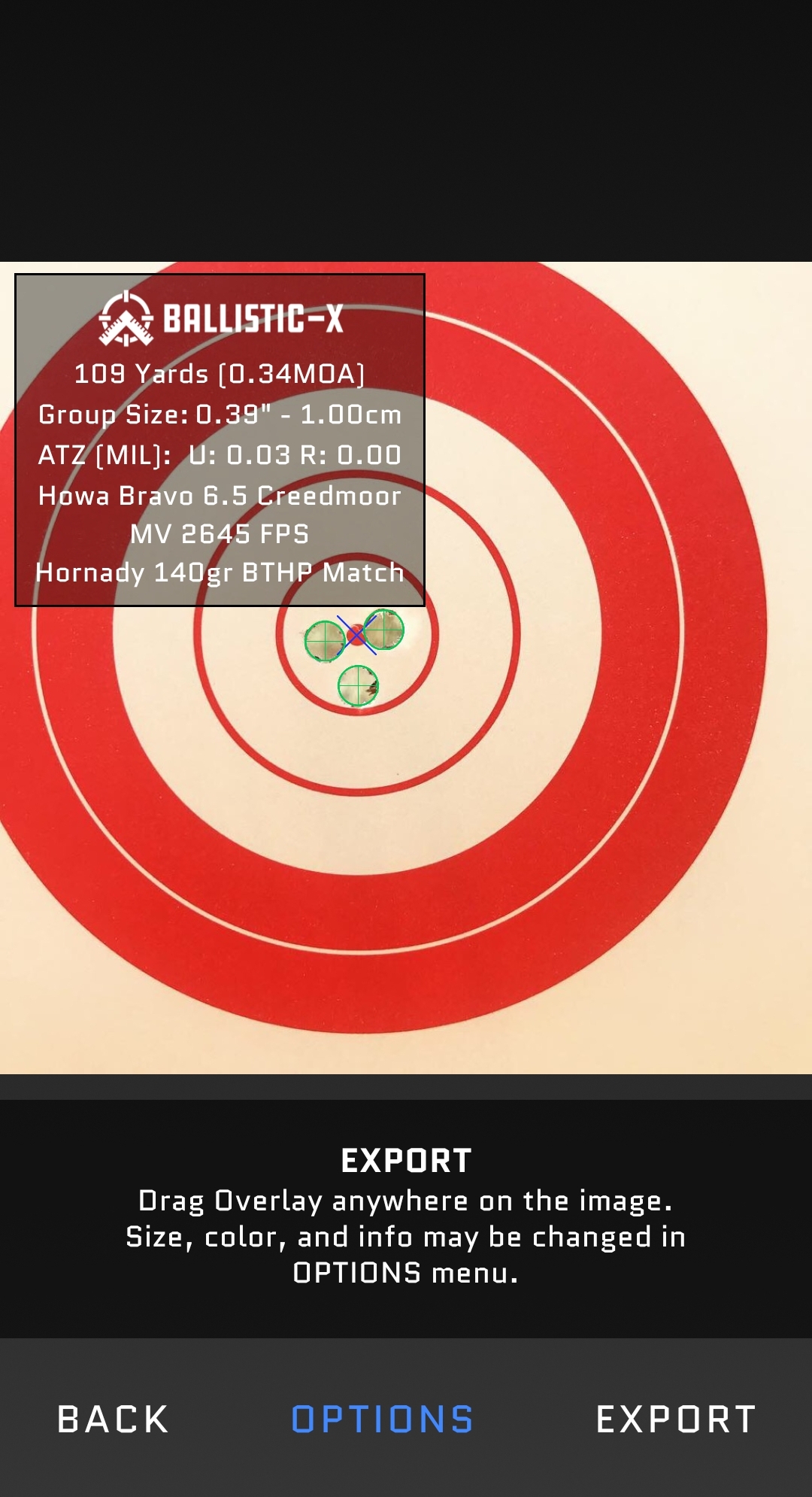 Once you click on the OPTIONS screen it gives you then option to add or subtract information from your overlay. It even has an Comments section. In here I like to put the rifle being used, MV and ammo used.