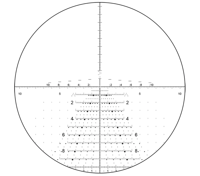 Looking at the reticle you will notice, like a traditional duplex reticle it has a center cross-hair (with a small aiming dot in the center) made by an intersecting horizontal and vertical stadia. Below that horizontal line you can see the wind dots on each mil line. Each mil line has seven wind dots either side of center with the fourth each side being larger than the others.